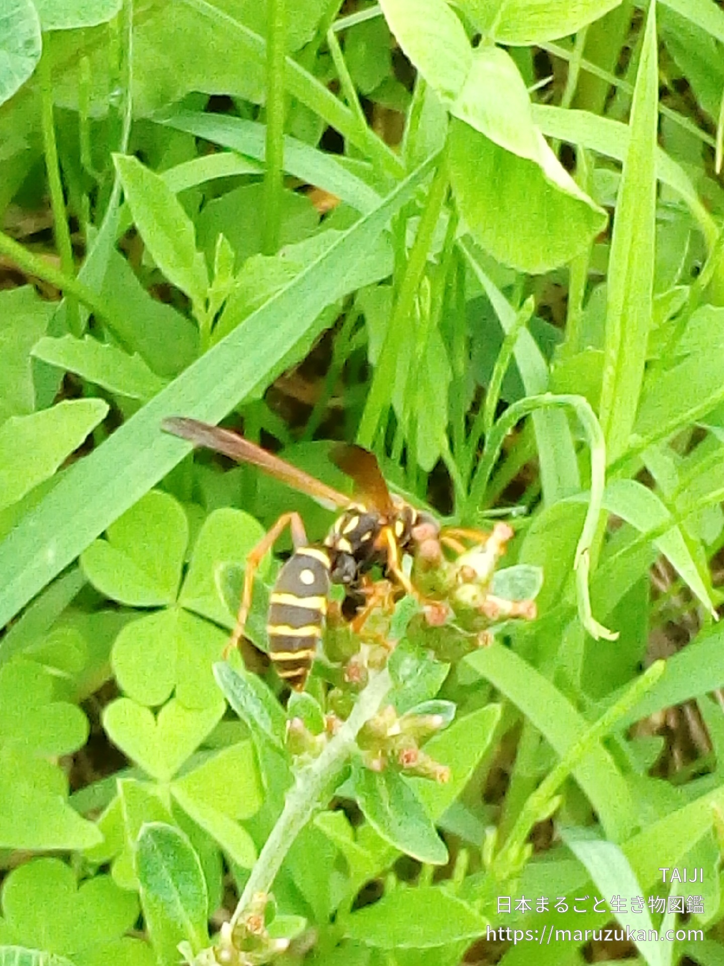 フタモンアシナガバチの画像を投稿する フタモンアシナガバチ(二紋脚長蜂) -Polistes chinensis- TAIJI 2019/07/28 (日) - 21:30 撮影日2019/07/20 地域 三重県 撮影・捕獲場所 道端 場所詳細草地 環境 天然・野生・自生 生育段階 成体 フタモンアシナガバチのフタモンの紋が見える写真を投稿します… 背中の胴体に丸い紋が2つあります…紋の位置がわかるだけでも同定の基準になると思います…(丸く黄色い模様)