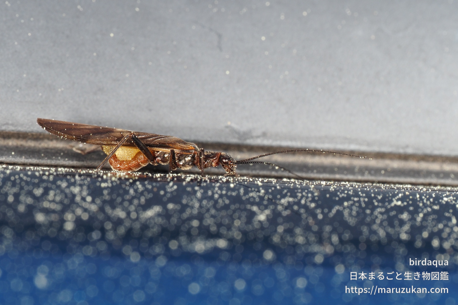 車を水面と勘違いして産卵にやってきた。卵をたくさん抱えている。