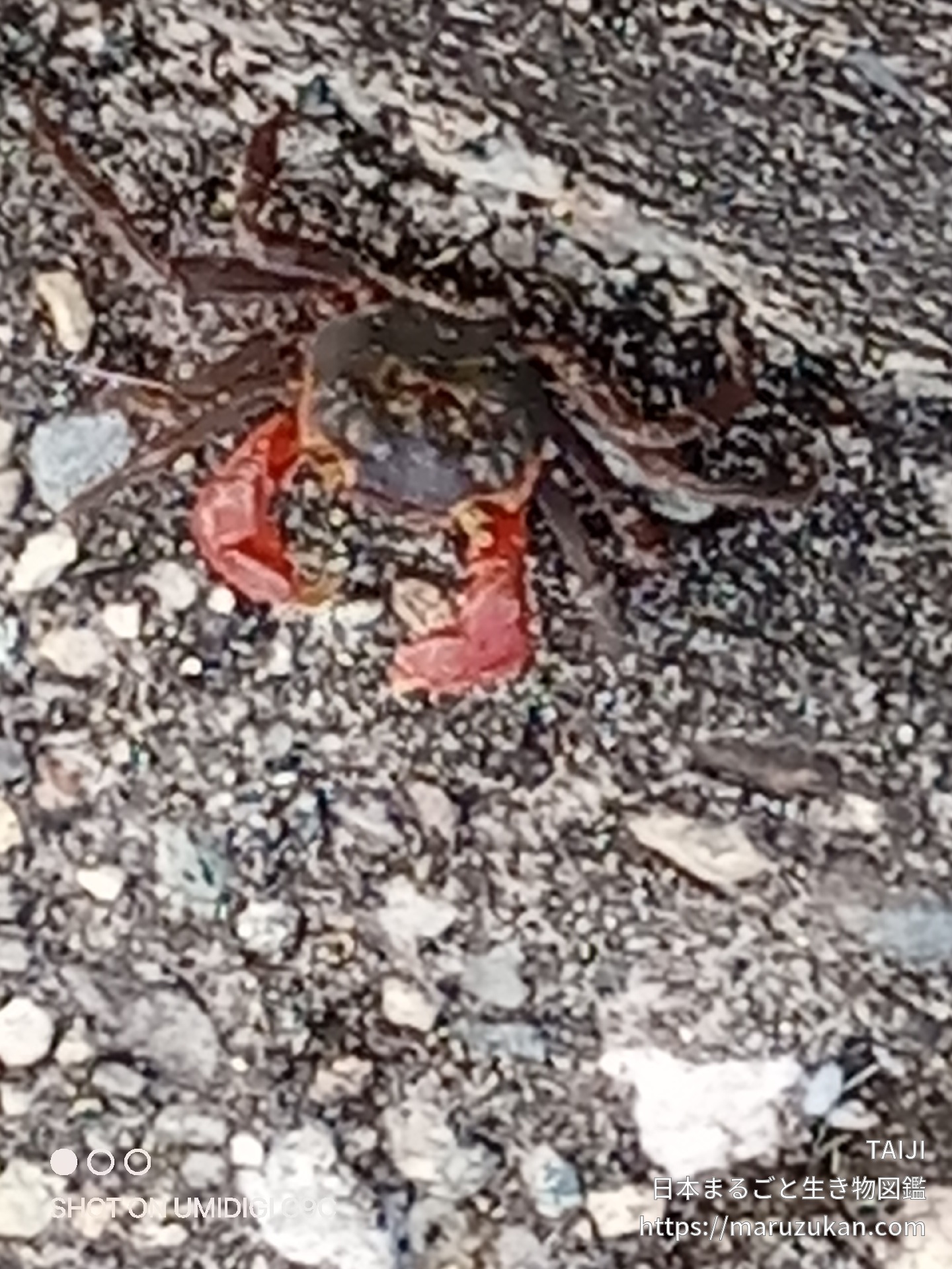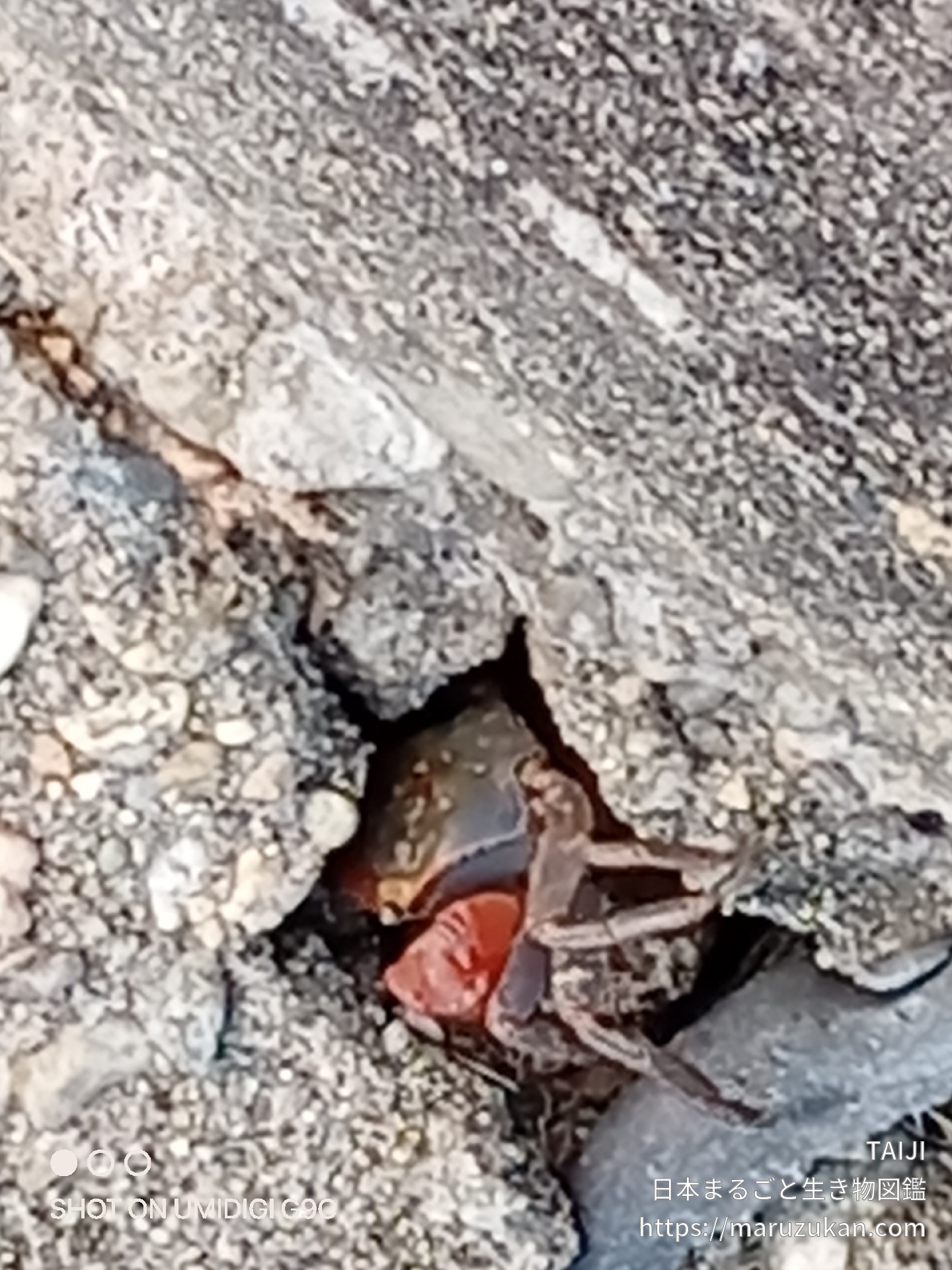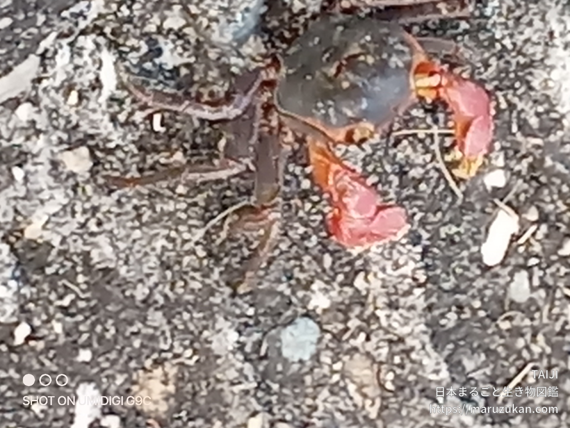 アカテガニの画像を投稿する アカテガニ(赤手蟹) -Chiromantes haematocheir- TAIJI 2025/07/03 (木) - 06:51 撮影日2025/07/02 地域 三重県 撮影・捕獲場所 淡水水辺 環境 天然・野生・自生 生育段階 成体 同定の自信 ★★★★☆(種までほぼ確実) 河川の汽水の海水が流入する場所で発見。少し解像度が良くないです。